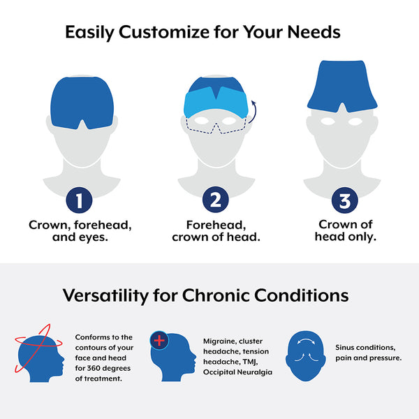Find relief with the Hot/Cold Relief Cap featuring a soft, pliable gel lining and movable eye cover. Flip the cover down for subtle eye compression and a light blocking experience. Flip the cover up for visibility during wear. The plush gel provides a snug and comfortable fit that conforms to the contours of your face and head for 360 degrees of treatment. Perfect for therapeutic relaxation, stress or chronic migraine relief!